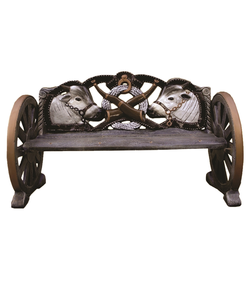 Banco em cimento, resistente, com ferragem nas rodas/assento/encosto, com detalhes de boi Nelore em alto-relevo, resistente, ideal para ambientes externos, pintado semi-brilho á base d`água.